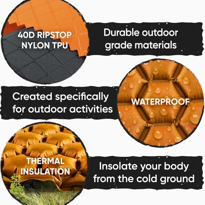 This inflatable sleeping pad is designed for comfort and convenience on outdoor adventures. Featuring ergonomic hexagon-shaped air cells that support your body’s pressure points, it delivers restful sleep whether you’re camping or backpacking. The lightweight construction and compact roll-up design make it easy to carry in your pack. With durable, waterproof nylon material and included repair kit and inflating bag, it’s built to perform across weather and terrain conditions.