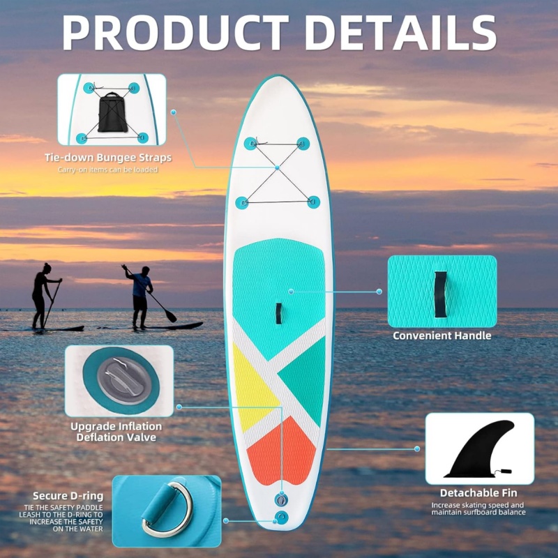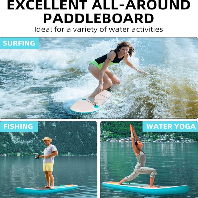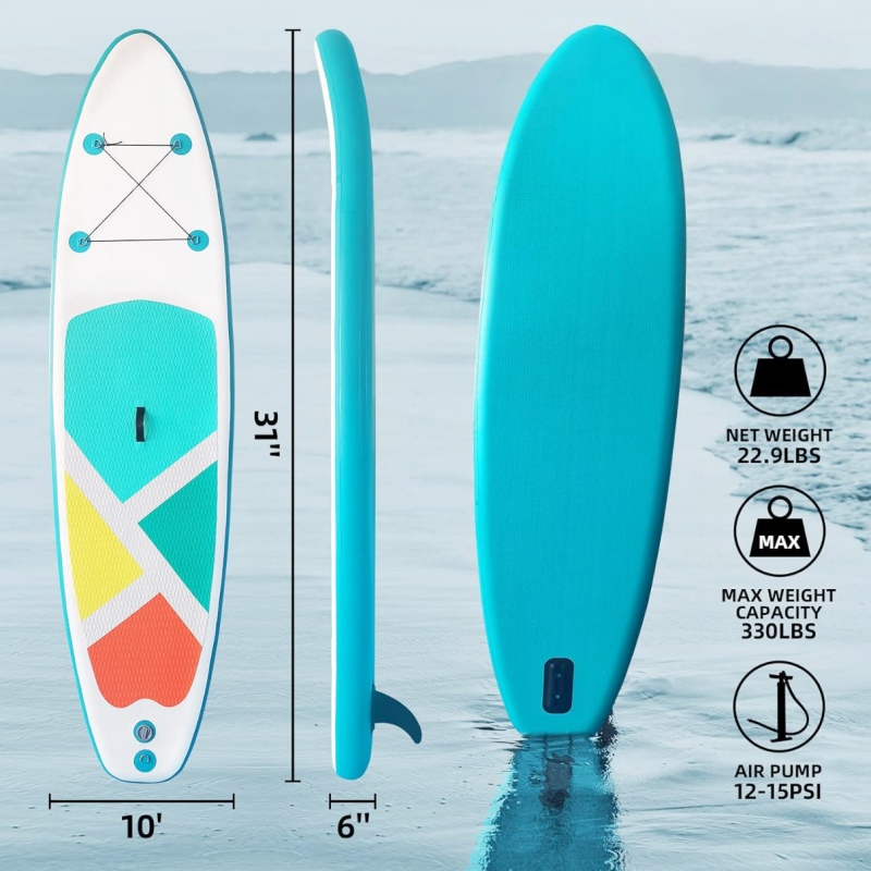 Portable & Easy to Use: The inflatable paddle board weighs 23 lbs and measures 124'' x 31'' x 6'' (10'4" x 31" x 6")with a load capacity of 330 lbs. You can stuff it into a backpack, luggage or car trunk for a trip. The moderate width and length of the sup board allows beginners to quickly balance on the paddleboard, ideal for doing water yoga, fishing, and surfing.