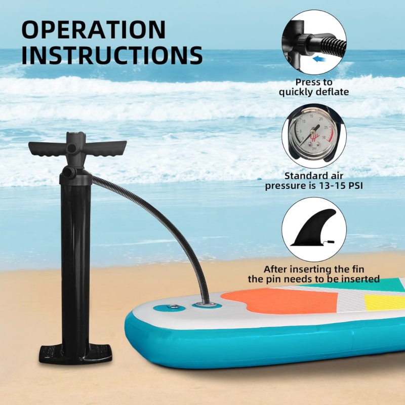 The portable air pump allows you to finish inflating your stand up paddleboard in 5 minutes, with a standard air pressure of 13-15 PSI for surfboard.